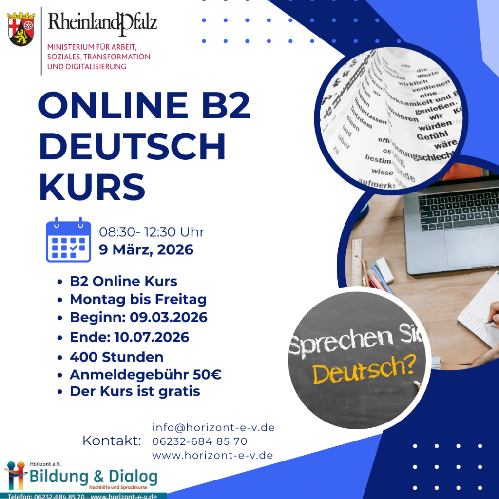 | B1 | 13.10.2025 – 27.02.2026 | Mo.-Do. 14:00-17:15 Uhr | Sprint Kurs „Online via Zoom mit Lehrkraft“ | 300 UE |